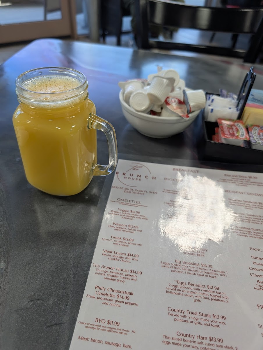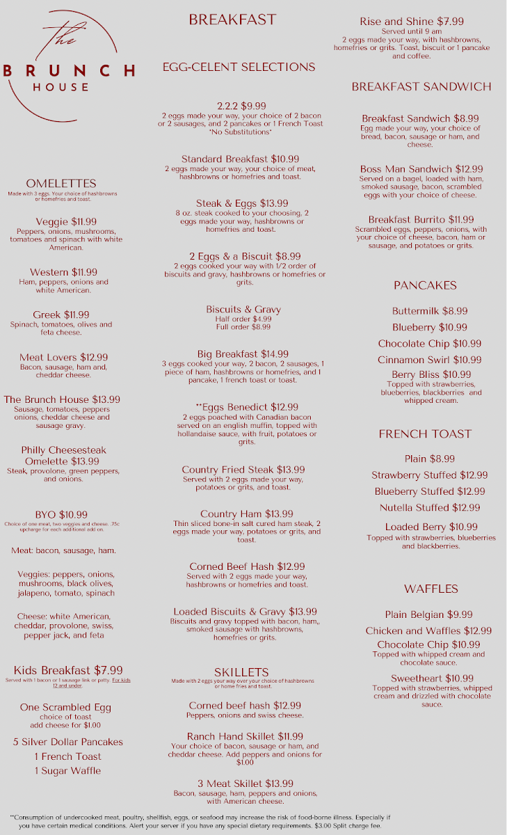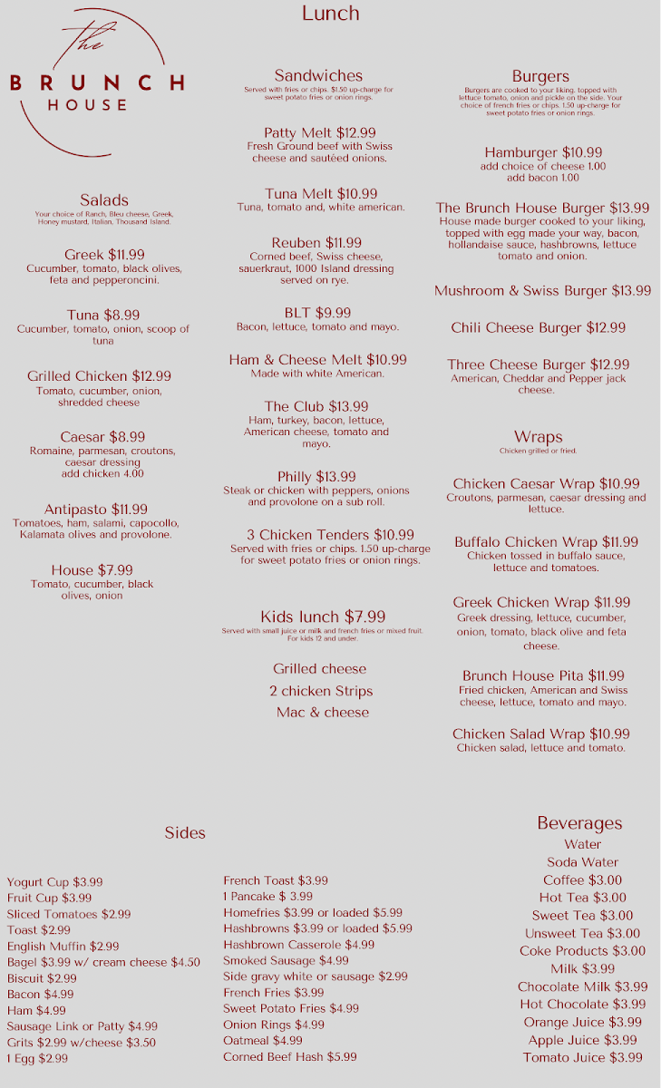 At The Brunch House Restaurant Menu, you'll discover a variety of dishes that bring comfort and creativity to your breakfast and brunch favorites. Located at 5855 SE 5th St in Ocala, FL, this charming spot offers a wide selection of hearty meals, ranging from classic eggs benedict to fluffy pancakes stacked high with fresh fruit. Whether you're in the mood for a savory scramble or a sweet treat, each dish is prepared with love and the finest ingredients. The cozy atmosphere makes it the perfect place to unwind with friends or family over a delicious meal. Dive into the menu and enjoy the variety of options that will surely satisfy every craving, from light bites to filling plates.